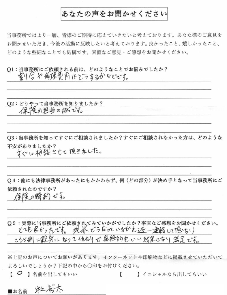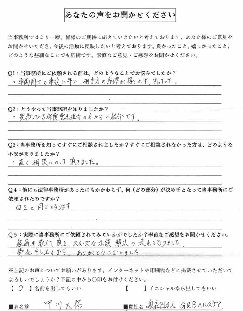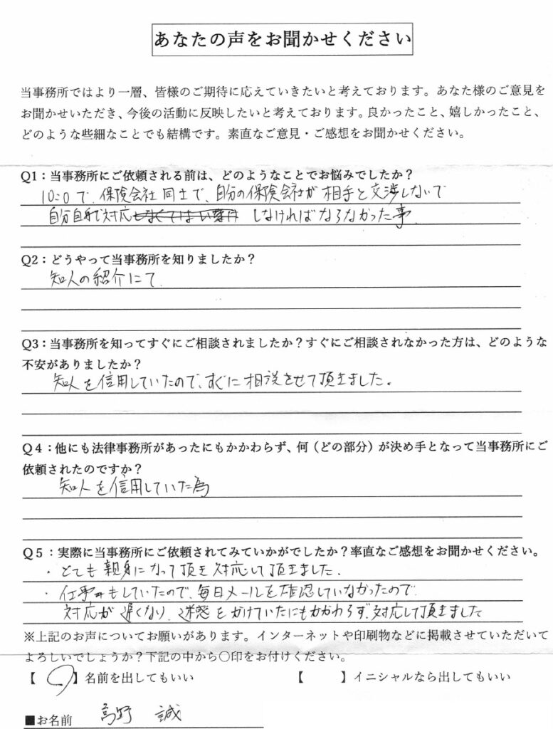 個人向けの業務として交通事故、労災事故などの人身傷害事故と遺言・遺産相続業務をメインに経験を重ねる。